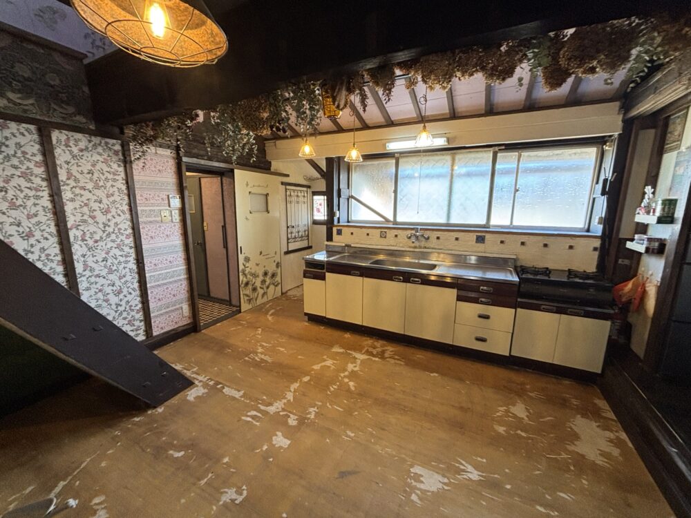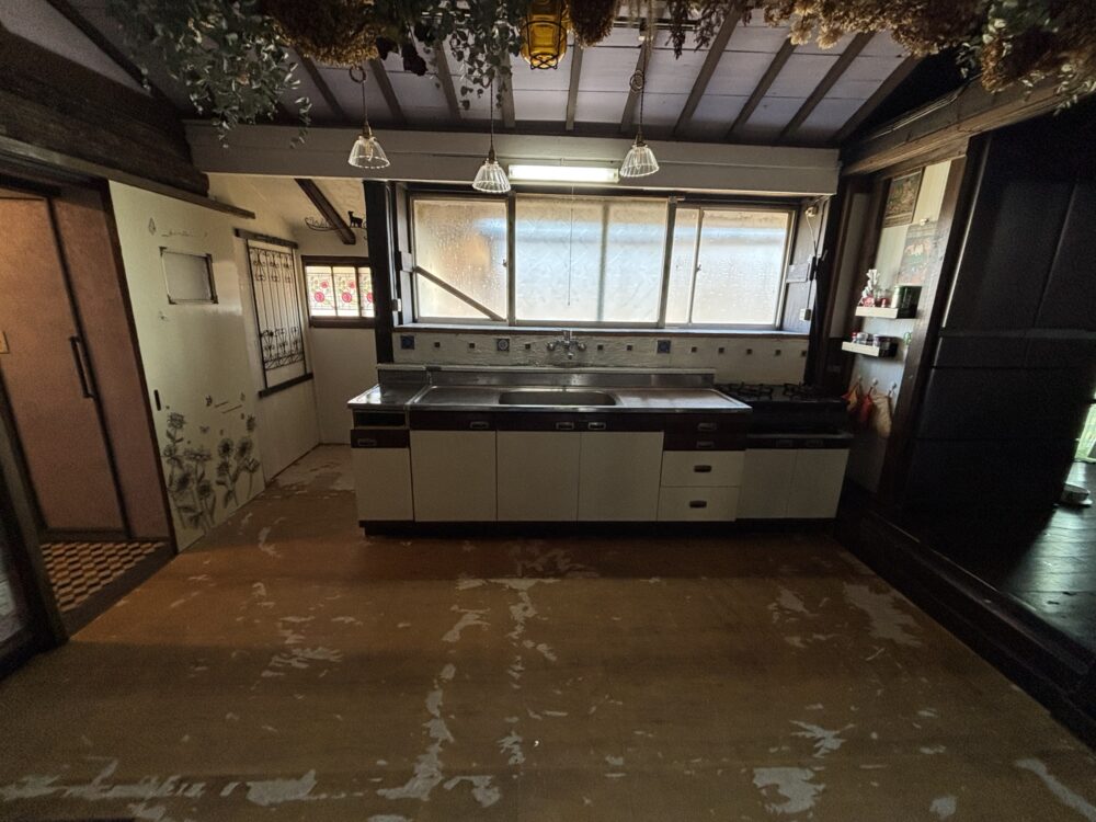 古くなっていたキッチンを取外し、床を張替え、キッチン周りにタイルをはりました!